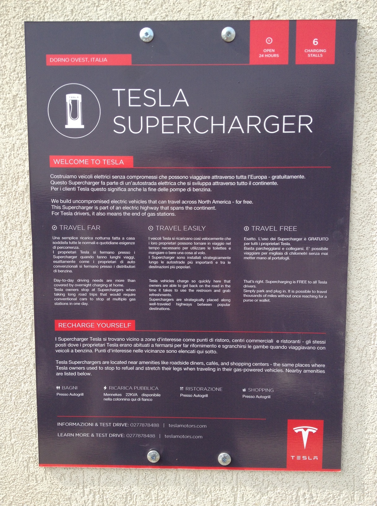 Come annunciato in un precedente articolo il primo supercharger in italia è stato aperto a Dorno tra Milano e Genova sulla A7.